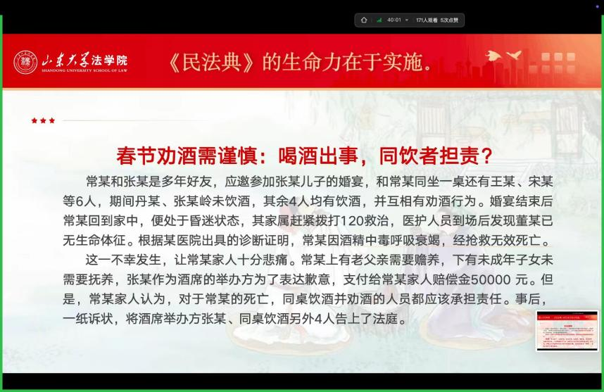 范艳华首先以一段生活化的普法视频引入本次宣讲主题,随后依次介绍了民法典的编纂背景、性质定义、章节构成和颁布的意义。时值农历乙巳蛇年来临之际,范艳华结合案例,详细介绍了常回家看看——子女对父母赡养义务、春节压岁钱——赠予合同、聚餐劝酒——劝酒者、共饮酒者责任义务等与节日活动息息相关的实用民法知识,让法治守护祥和春节。在宣讲最后的问答环节,参会同学对宣讲知识进行回顾,加深理解。