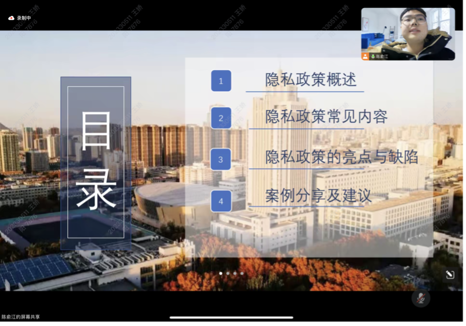 首先,陈俞江介绍了隐私政策的定义及其作为用户与平台之间“契约”的重要性。随后,他详细解读了信息收集的必要性、信息使用的合规性、信息共享的风险与规范、信息存储与保护的技术手段,以及用户查询、更正、删除个人信息的权利等关键条款。最后,结合实际案例,主讲人深入剖析隐私政策在个人信息保护中的作用,并针对大学生在网络使用中常见的风险,提出了具体防范建议。