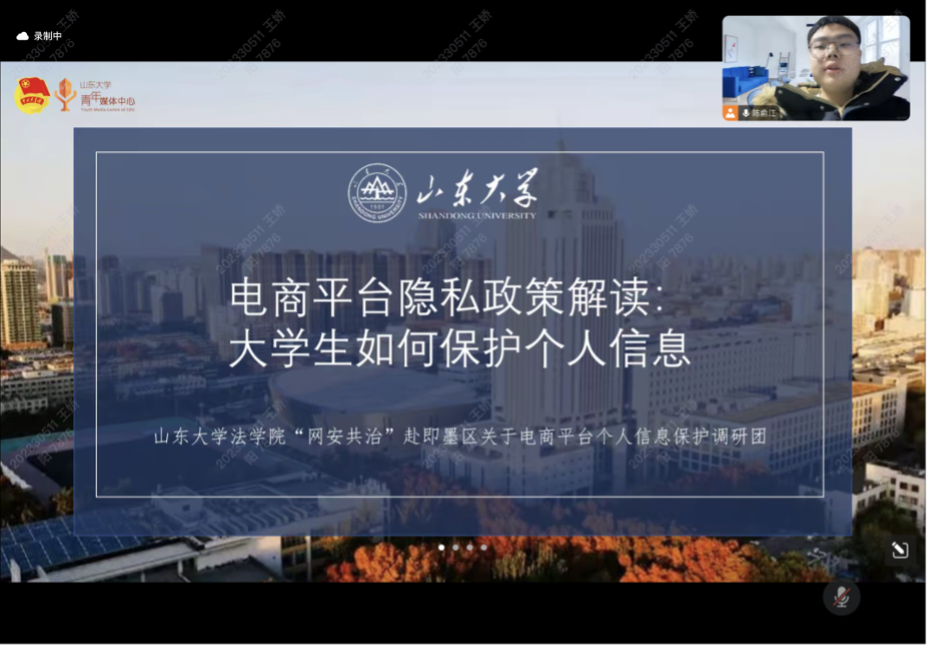 为普及网络安全法律知识,提升大学生信息安全意识,法律硕士(非法学)第二党支部联合艺术学院美术系设计系学生党支部、集成电路学院本科生党支部、文学院硕士研究生第三党支部、公共卫生学院博学四支部、护理与康复学院第四党支部、第六党支部开展“网安共筑,隐私共护——电商平台隐私政策解读”普法宣传活动,支部成员陈俞江担任主讲。