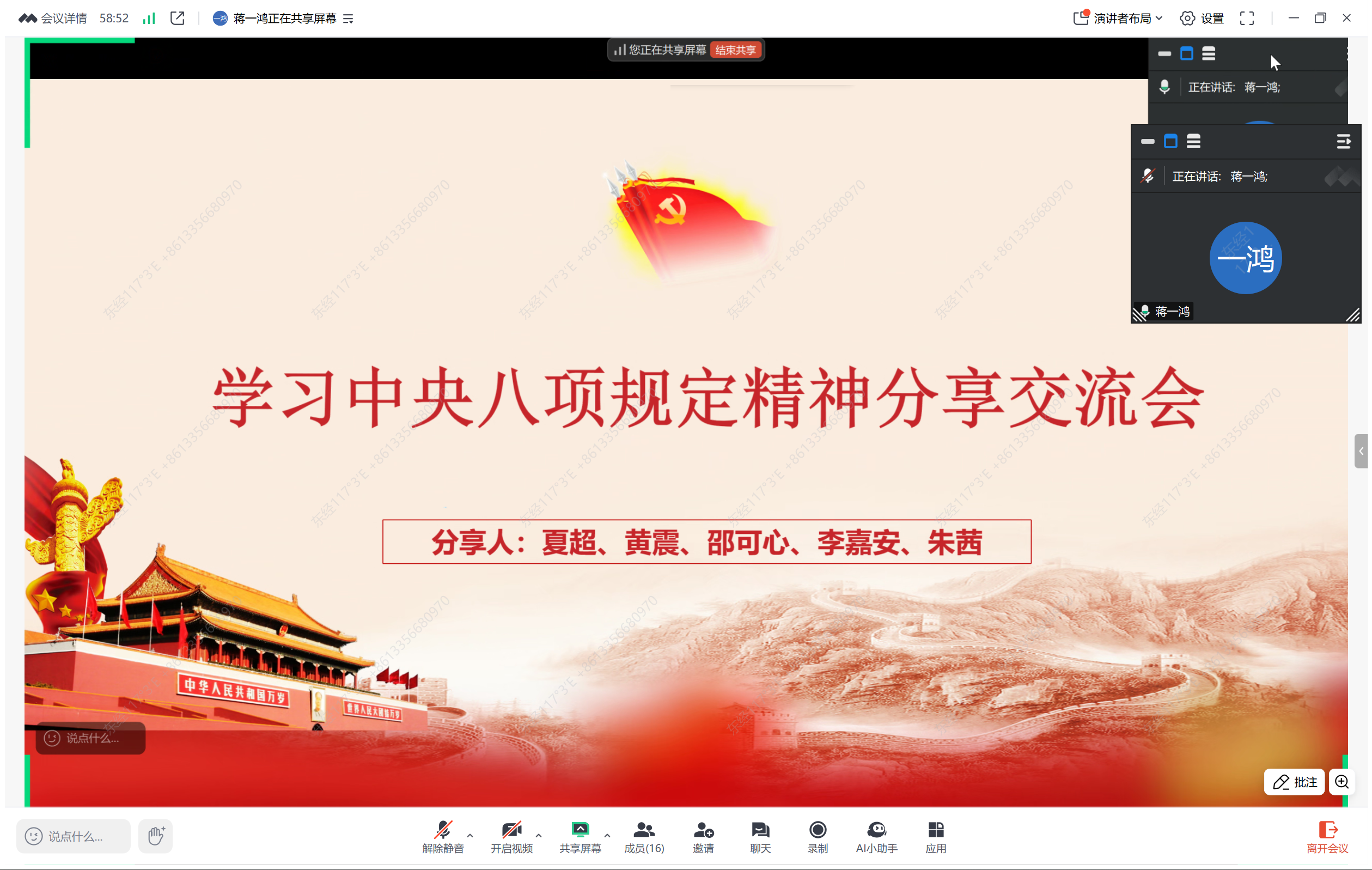 此次分享会既是对前期理论学习的阶段性总结,更是对支部党纪学习成果的进一步巩固。未来支部成员将继续以八项规定精神为指引,踏实钻研,求真务实,将学习成果转化为治学修身的具体行动,让法治信仰在躬身实践中扎根生长,为推进全面依法治国贡献青年力量。