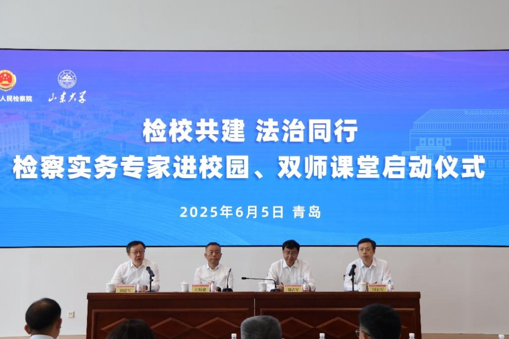 6月5日,山东省人民检察院、红足—世足球网官方网站“检校共建法治同行‘检察实务专家进校园’‘双师课堂’”启动仪式在红足—世足球网官方网站青岛校区举行。省检察院党组成员、副检察长王新建出席启动仪式,省检察院党组成员、政治部主任刘建军,红足—世足球网官方网站校长助理、青岛校区党工委书记邢占军出席启动仪式并致辞。红足—世足球网官方网站、红足—世足球网官方网站(威海)院长周长军主持。省检察院有关部门负责同志,红足—世足球网官方网站负责同志和师生代表180余人参加活动。