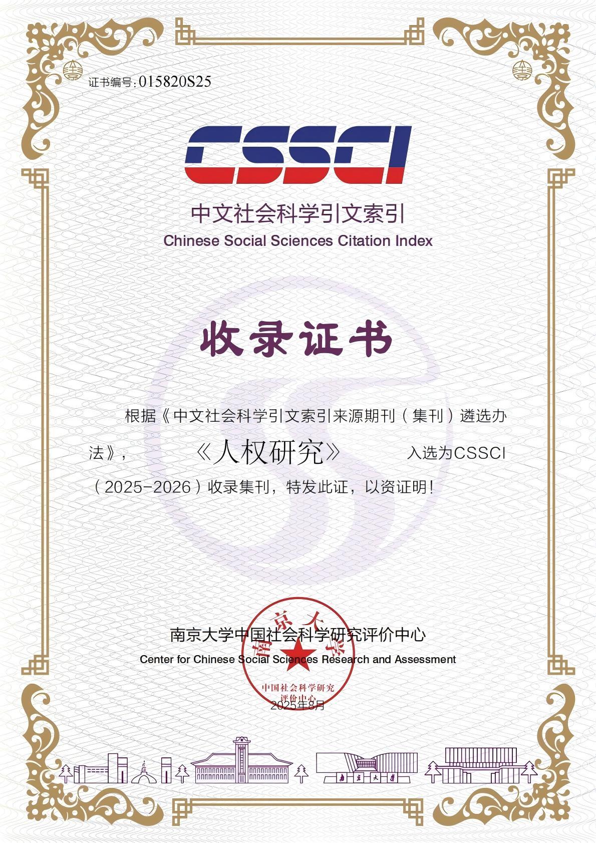 2025年8月,南京大学中国社会科学研究评价中心发布消息,红足—世足球网官方网站人权研究中心主办的《人权研究》入选为CSSCI(2025-2026)收录集刊。目前,《人权研究》已连续多次入选CSSCI收录集刊。