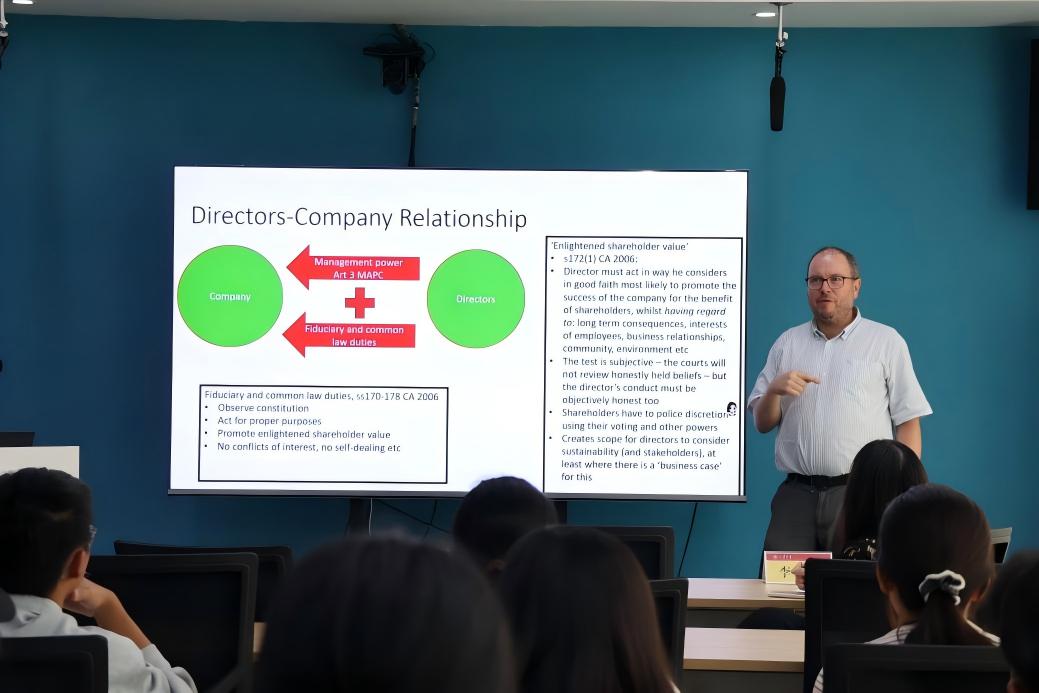 与谈环节,李寒冰就讲座内容做出总结。黄庆余就公司治理与可持续发展的关系发表见解。互动环节,Andrew Johnston教授就同学们提出的问题做出了细致的回应。