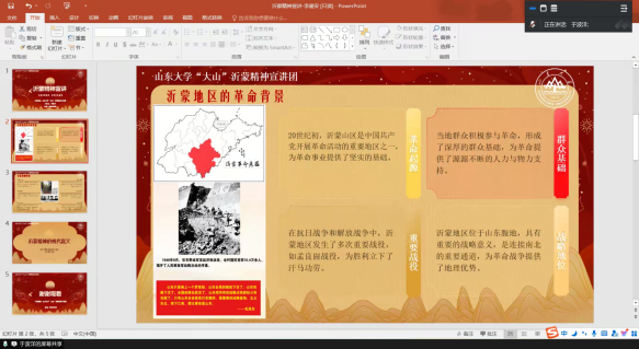 支部成员于波洋作为宣讲团代表从沂蒙老区的历史背景、沂蒙山区在中国革命中的重要地位以及沂蒙精神的含义等角度深度阐释了沂蒙精神的丰富内涵和深远影响,让全体支部成员在回望历史中深入感受了沂蒙精神的内核。宣讲中,于波洋还强调了沂蒙精神在新时代的价值和意义,号召同学们从点滴做起,传承沂蒙精神,做学习的“攀登者”,面对难题不退缩;做温暖的“小太阳”,积极参与志愿服务,传递正能量;做信仰的“守护人”,坚定信仰,让红色基因在心中扎根。