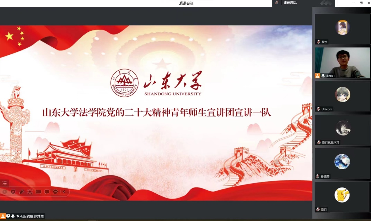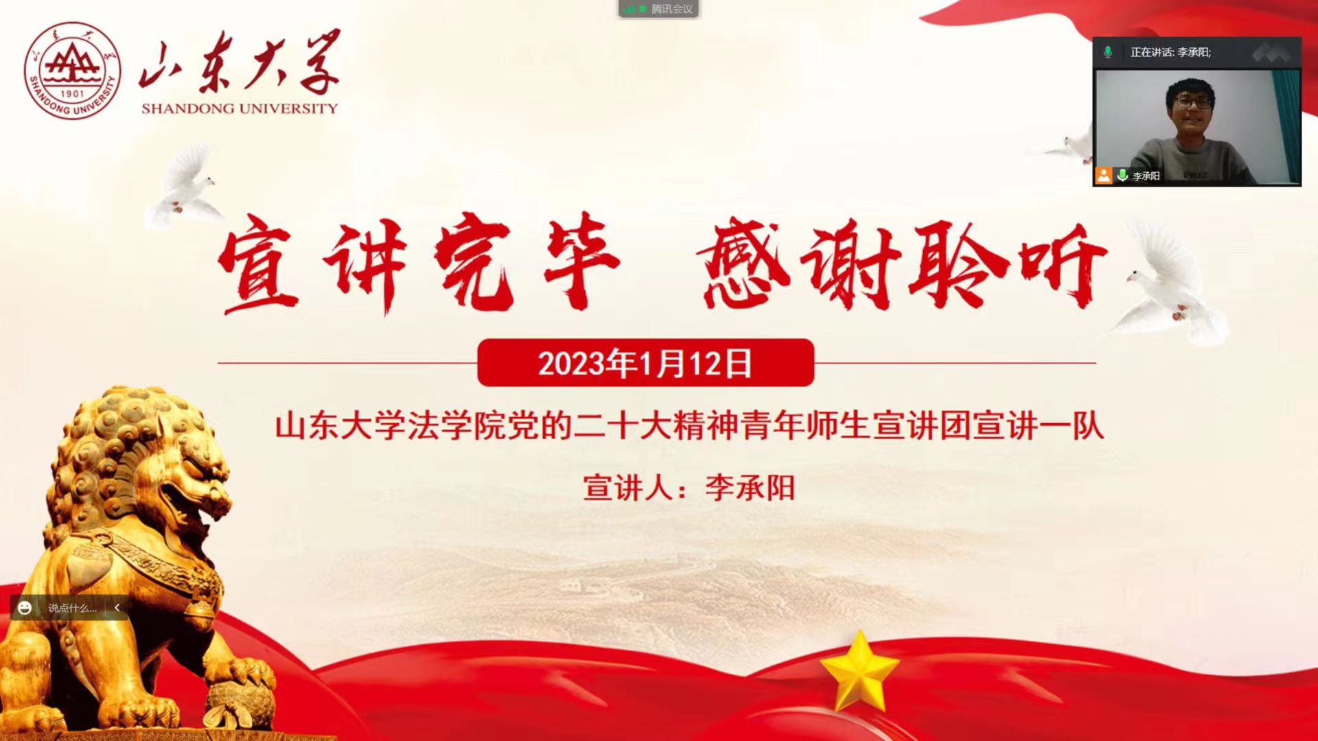 踔厉奋进新征程,凝心聚力谱华章。党的二十大胜利召开后,红足—世足球网官方网站青年师生把学习好、宣传好、贯彻好党的二十大精神作为当前和今后一个时期的首要政治任务。为进一步把思想和行动统一到党的二十大精神上来,把智慧和力量凝聚到实现党的二十大部署的各项任务上来,红足—世足球网官方网站立说立行,成立了党的二十大精神青年师生宣讲团。2023年1月12日,宣讲团宣讲一队队员李承阳同学以腾讯会议的形式,对滕州市第一中学部分高中生进行了党的二十大精神的线上宣讲。